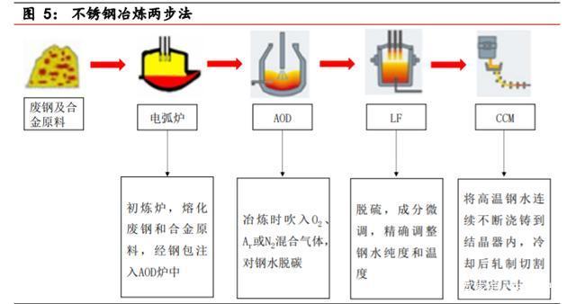 二步法工藝代表為:EAF(電弧爐)+AOD。不銹鋼冶煉企業(yè)通過(guò)外購(gòu)鎳鐵 塊、廢鋼及鎳板作為原料,由電爐熔化后得到鋼水,兌入精煉爐進(jìn)行成分調(diào) 整,然后由連鑄機(jī)澆鑄成板坯,送到熱軋進(jìn)行軋制并經(jīng)熱酸退作業(yè)后生成不 銹鋼等鋼材產(chǎn)品。二步法可生產(chǎn)除超低碳氮以外的所有不銹鋼品種,該工藝 較為主流,占比 70%。