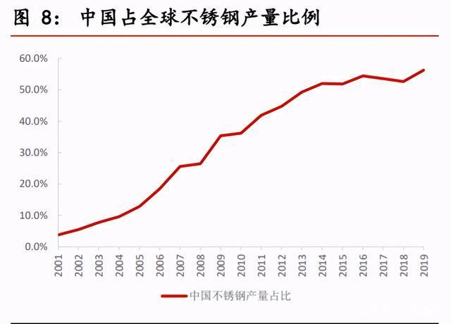 2000 年以來(lái),中國(guó)不銹鋼產(chǎn)能產(chǎn)量快速擴(kuò)張,2000 年,中國(guó)不銹鋼產(chǎn)量占 全球比例僅 3.8%,2014 年中國(guó)占比首次突破 50%,2019 年中國(guó)產(chǎn)量占比 56%。除中國(guó)外,其他主要生產(chǎn)不銹鋼的國(guó)家和地區(qū)分別為:歐洲(13%)、 印度(7.5%)、日本(5.7%)和美國(guó)(5%)。